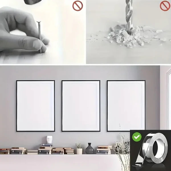 Reutilizable, lavable y ultra resistente. Con tecnología nano, esta cinta transparente de doble cara se adhiere a cualquier superficie sin dejar residuos ni dañar tus paredes